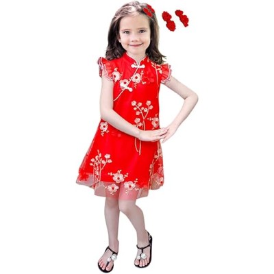 Girls Chinese Cheongsam Qipao Traditional Floral Pretty Flowy Embroidered Floral Dress with Matching Hair Clips Outfit