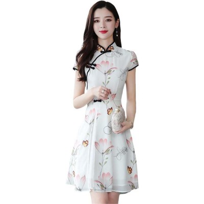 Summer Modern Improved Cheongsam Chiffon Printing Vintage Traditional Chinese Style Slim Qipao Dress