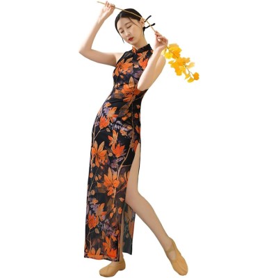 Chinese Qipao Dress for Women Cheongsam Dress Mandarin Collar Chinese Dresses Traditional Clothes Non Sleeve Printed Black