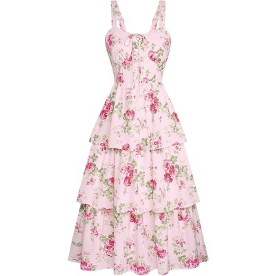 Women's Floral Maxi Dress Summer Wedding Guest Dress Tiered Sleeveless Lace Up Corset Sundress