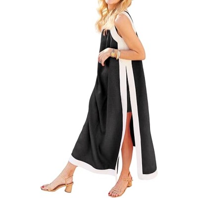 Women's 2 Piece Sets Boho Color Block Sleeveless Maxi Dress Matching Shorts with Pockets