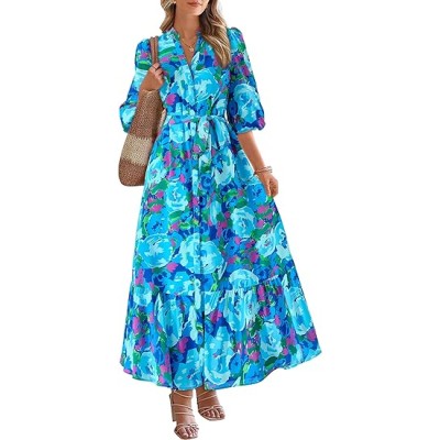 Womens Floral Maxi Dresses Boho Summer Casual V Neck 3/4 Puff Sleeve Button Down Tie Waist Long Flowy Shirt Dress