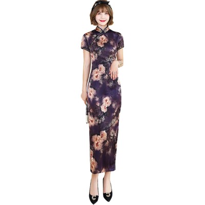 Women's Chinese Floral Short Sleeve Slim Fit Ankle Length Qipao Tradtional Dress Vintage Cheongsam Dress Evening
