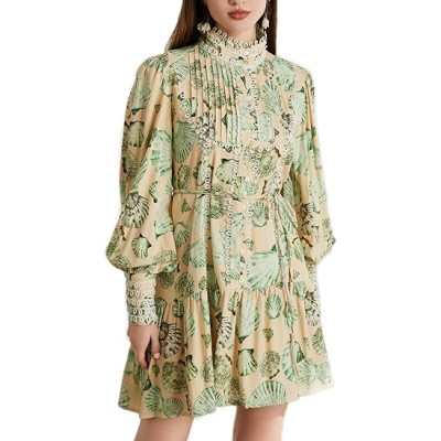 Women's V Neck Long Sleeve Floral Print Belted Mini Dress Casual A Line Short Dress