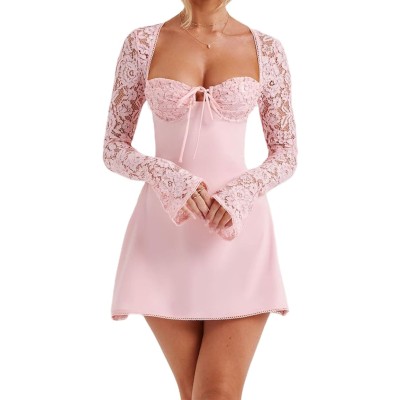 Women Lace Mini Dress Sexy Square Neck Lace Long Sleeves Backless Tie-Up A-Line Short Dresses Cocktail Bodycon Dress