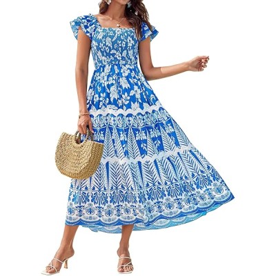 Women's Summer Flowy Maxi Dress Casual Cap Sleeve V Neck Smocked Beach Sundress
