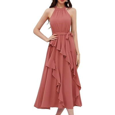 Women's 2024 Summer Sleeveless Halter Neck Ruffle Hem Split Flowy Swing Long Midi Dress with Belt