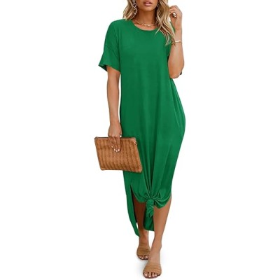 Womens Summer T Shirt Dress Casual Drop Shoulder Round Neck Maxi Dresses Loose Side Slit Midi Dress with Pockets