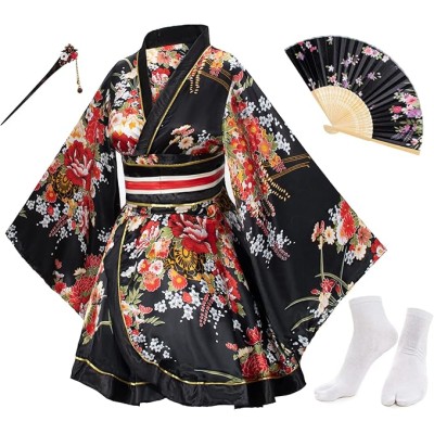 Japanese Anime Women's Dance Kimono Robe Fancy Dress Hand Held Silk Folding Fans Tabi Hairstick Socks Set
