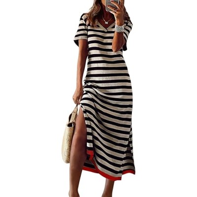 Summer Dress Casual Womens Fashion Short Sleeve Maxi Dress T Shirt Dress Striped Long Color Block Maxi Dress
