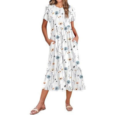 Women Summer Midi A Line Dress Short Sleeve Casual Flowy Tiered Beach Long Sundress with Pockets 2025 Vacation Travel