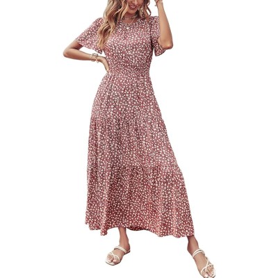 Women's Summer Casual Short Flutter Sleeve Round Neck Smocked Waist Tiered Boho Floral Flowy Maxi Dress