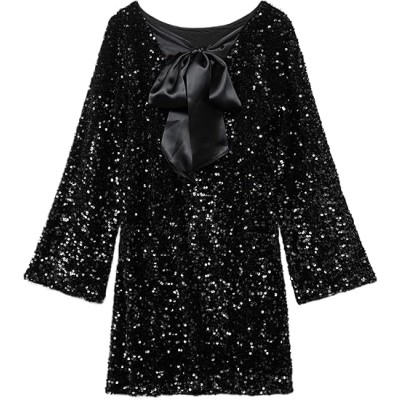 Womens Long Sleeve Sparkly Sequin Mini Dress Backless Bow Tie Short Dress Loose Fit Party Cocktail Glitter Dresses