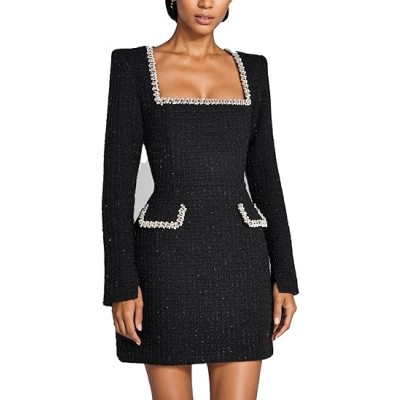 Women Elegant Tweed Mini Dress Long Sleeve Square Neck Pearl A Line Formal Prom Business Party Short Dresses