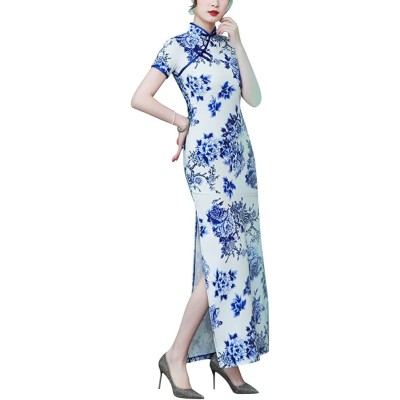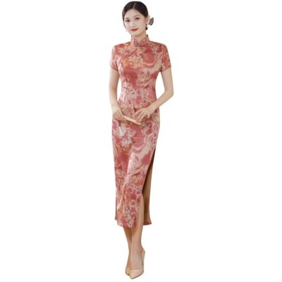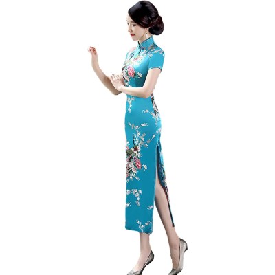 2022 Mandarin Faux Silk Long Cheongam Qipao Dress with Split for Women