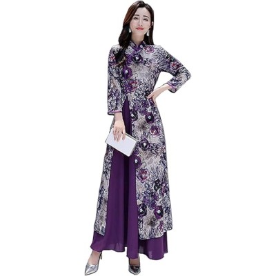 Purple Chinese Style Qipao Women's Birthday Party Collar Floral Long Cheongsam Dress Retro Gown