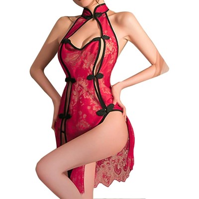 Retro Cheongsam Sexy Mesh Lace Floral Qipao Long Dress Anime Lingerie Costumes