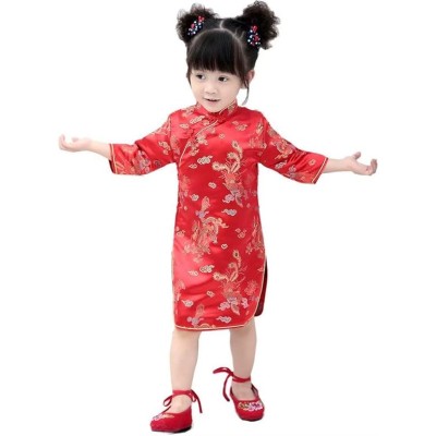 Girls Dress Chinese Dragon Phoenix Qipao Half Sleeve Cheongsam Dress Princess Birthday Party Costume