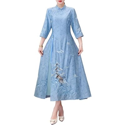 Women's New Chinese 3/4 Sleeves Embroidery Cheongsam Layered Look Elegant Qipao Maxi Dress